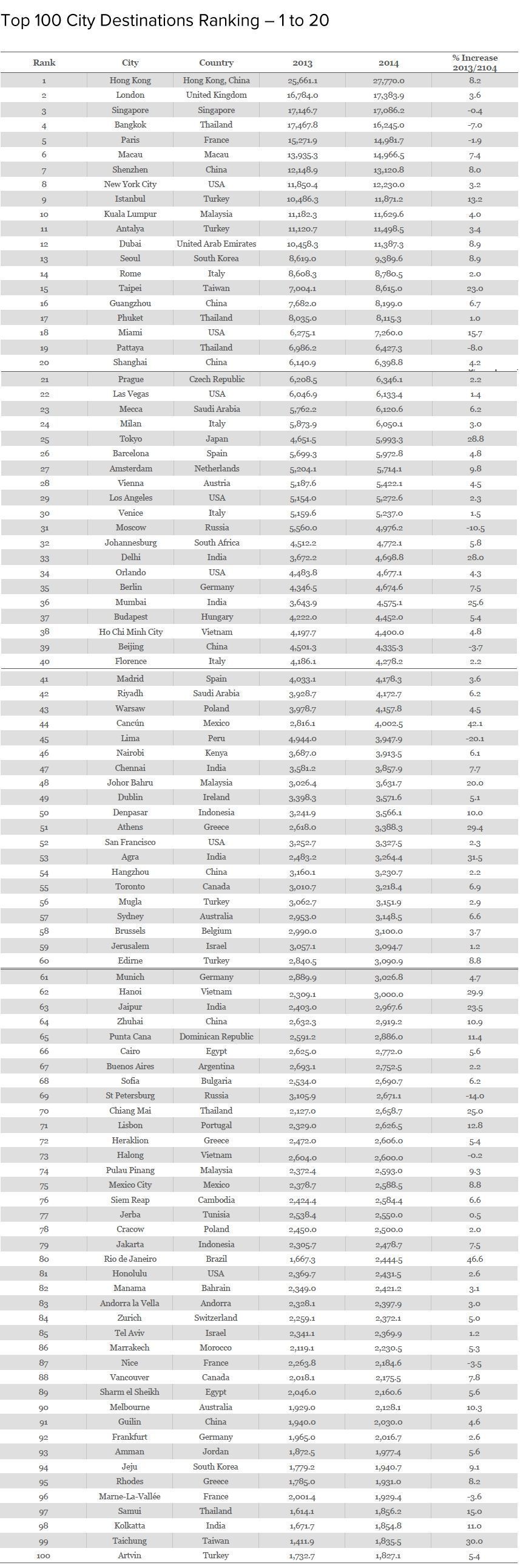 However, China is not only an important outbound market. China has seven cities in the top 100 ranking, which is the same amount as the US. All cities registered healthy growth, with the exception of Beijing, which has been hampered by increasing reports of air quality. The high number of cities, however, illustrates how China is not only the largest outbound market, but is also gaining global dominance as a destination for business and leisure tourism.