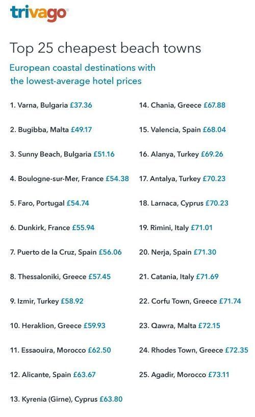 Thessaloniki, Heraklion, Chania, Corfu and Rhodes, are among 25 cheapest European beach towns in for British tourists, according to hotel search website trivago.co.uk study with three money-saving infographics.
