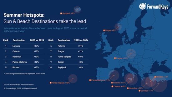 The two Greek destinations, with increases of 13% and 12% respectively, are in the top five of European destinations showing the largest increase in international air arrivals according to ForwardKeys data for the period June – August 2025, compared to the corresponding period last year, with Heraklion being the third most rising destination and Rhodes the fifth at a European level.