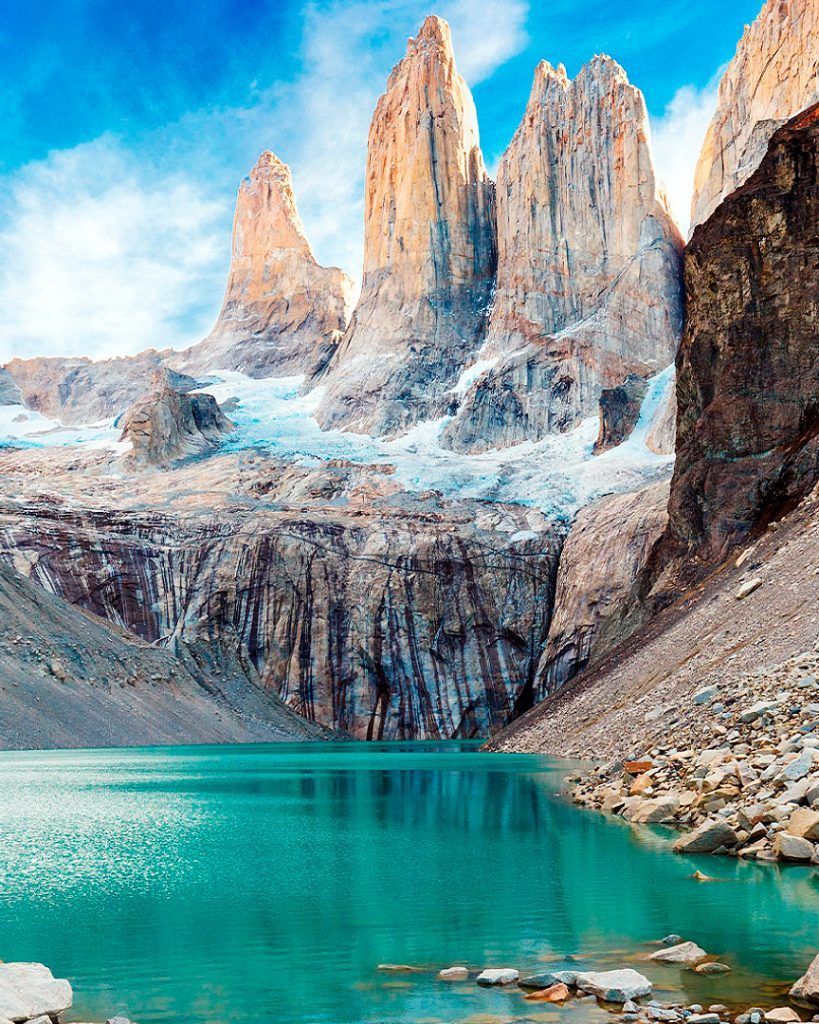 The “W” trail in Torres del Paine is not for hasty tourists. It lasts 4-5 days and requires endurance. The first day leads to the base of three granite towers rising vertically above a frozen lagoon. The air here is so pure and cold it “burns” pleasantly in the lungs. The legendary wind of Patagonia, which can reach 150 km/h, howls.
