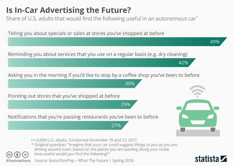 Statista.com reports that aside from the home, one of the last bastions of the ad-free life is the car. Other than the badge on the steering wheel, the interior of a car is blissfully empty of any brands or companies trying to push their products or services on you (assuming you avoid the radio, of course). With an autonomous future on the horizon, though, could this all be about to change?