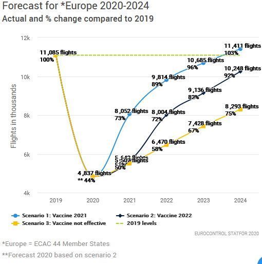 The forecast shows that the evolution of the aviation sector is strongly dependent on how soon an effective vaccine is made widely available and by levels of public confidence.