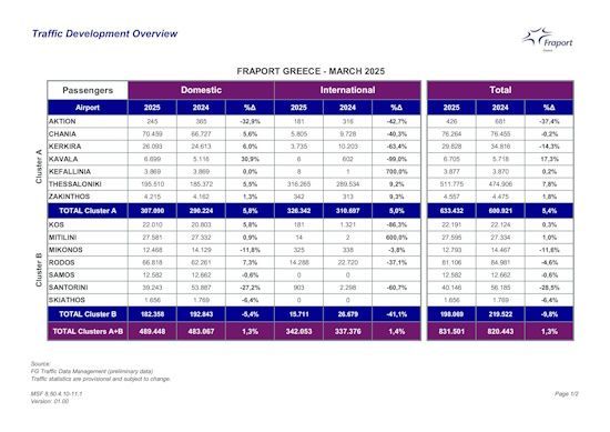 Thessaloniki Airport also recorded a steady increase, with 511,775 passengers passing through in March, compared to 474,906 passengers in the corresponding month of 2024 (+7.8%). In the quarter, the airport handled 1,375,782 passengers, compared to 1,268,681 in the previous quarter (+8.4%).