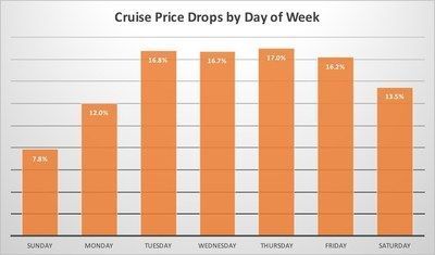 The search engine analyzed more than 600,000 cruise price reductions during the last years. According to the data, there were more than twice as much price drops on Thursdays than on the slowest day, Sunday.