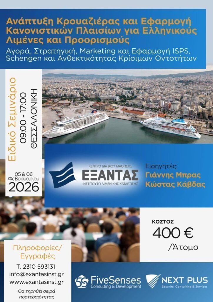 Aiming to provide practical tools, strategic knowledge, and operational readiness to stakeholders and professionals involved in the cruise sector, EXANTAS Port Training Institute is organizing on February 56 in Thessaloniki a two-day seminar, the first of its kind in Greece, exclusively for Greek ports and destinations.