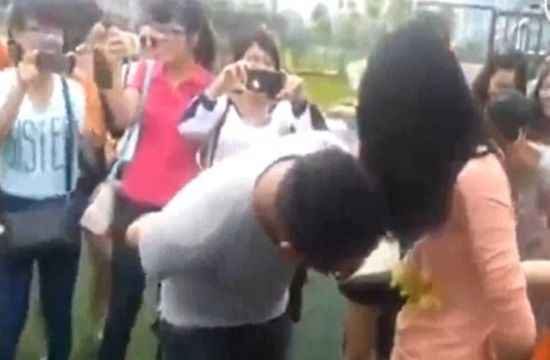 During a Chinese company’s party, a group of smartly dressed men with their hands tied bend over tried to gobble the grapes from their female colleagues breasts.