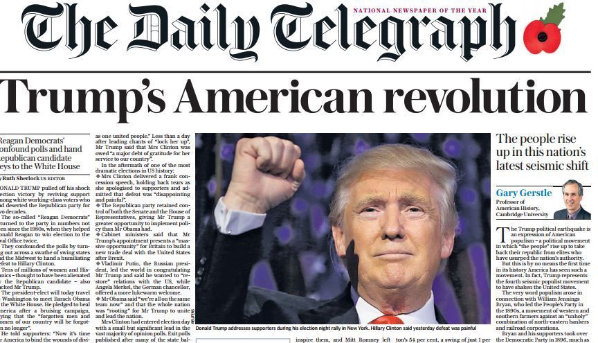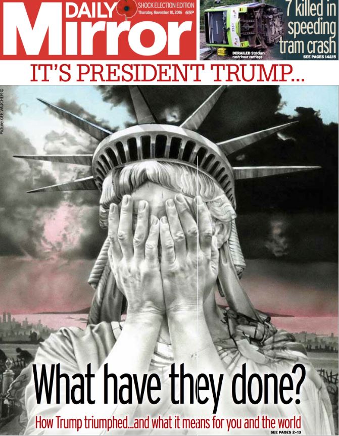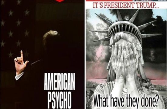 The unexpected victory of Donald Trump in the US Presidential elections sent shockwaves across the planet, with the front pages of major newspapers capturing the sentiment of astonishment and disbelief for the result. Ranging from titles like French newspaper’s “Liberation” reading “American Psycho” on its front page with a dark-lit Donald Trump figure holding up his finger in the shape of a gun, to the statue of Liberty holding its face in its palms titled “What have they done?” in “Daily Mail”, the global media chimed in on the US elections results.