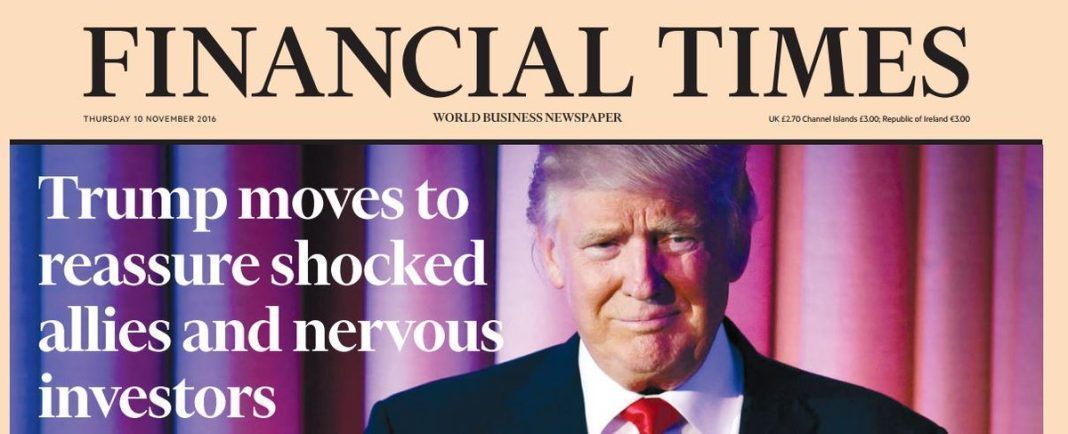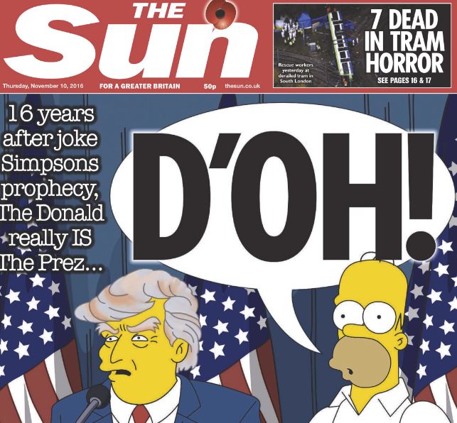 “The Guardian” used a less emotional tone opting for “Trump wins. Now the world waits”, while “The Daily Telegraph” has a more positive take writing “Trump’s American revolution”. Economic newspaper “Financial Times” uses the title “Trump moves to reassure shocked allies and nervous investors” after the initial jitters his election caused to global markets, while “The Sun” remembers a 16-year-old joke by famous cartoon TV series “The Simpsons” with cartoon Homer Simpson next to a Donal Trump figure with a bubble reading “D’OH!”.