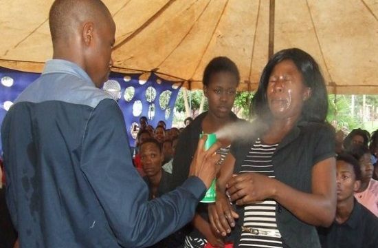 Pastor Lethebo Rabalago, of the Mount Zion General Assembly in Limpopo recently posted images on his Facebook page that showed him spraying the faces of willing congregants with Doom Super Multi Insect Killer in order to cure their various ailments.