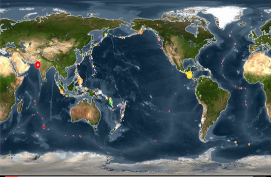 This animation shows every recorded earthquake in sequence as they occurred from January 1, 2001, through December 31, 2015, at a rate of 30 days per second. The earthquake hypocenters first appear as flashes then remain as colored circles before shrinking with time so as not to obscure subsequent earthquakes. The size of the circle represents the earthquake magnitude while the color represents its depth within the earth. At the end of the animation it will first show all quakes in this 15-year period. Next, it will show only those earthquakes greater than magnitude 6.5, the smallest earthquake size known to make a tsunami. Finally it will only show those earthquakes with magnitudes of magnitude 8.0 or larger, the “great” earthquakes most likely to pose a tsunami threat when they occur under the ocean or near a coastline and when they are shallow within the earth (less than 100 km or 60 mi. deep).