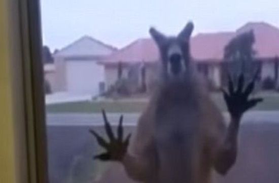 Terrifying footage has emerged of the moment a buff kangaroo tries to break its way through the window of a family home.