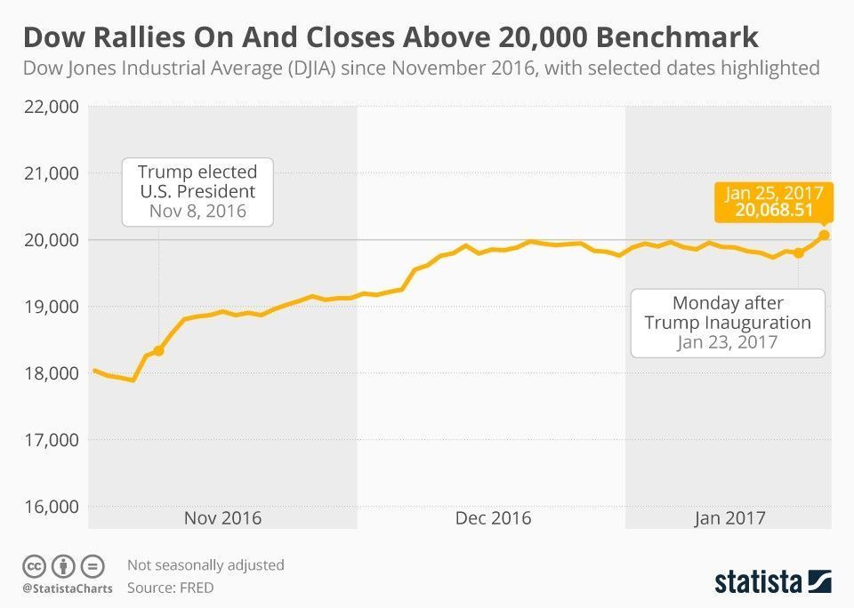The Dow Jones Industrial Average finished above 20,000 for the first time, marking yet another milestone in the stock market’s post-election hike. As our infographic shows, the Dow started its hike a few days before Donald Trump was elected U.S. President on Nov. 8, 2016, cooled a little for added uncertainty on election day, and then carried on.